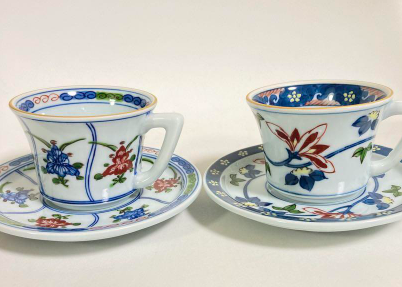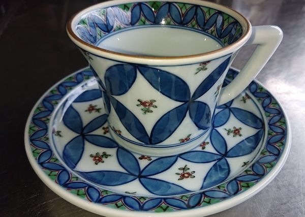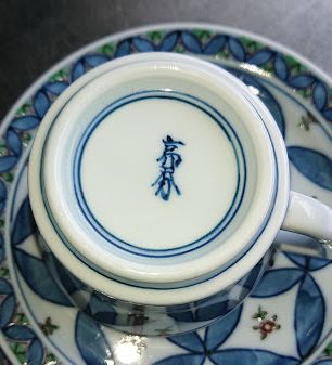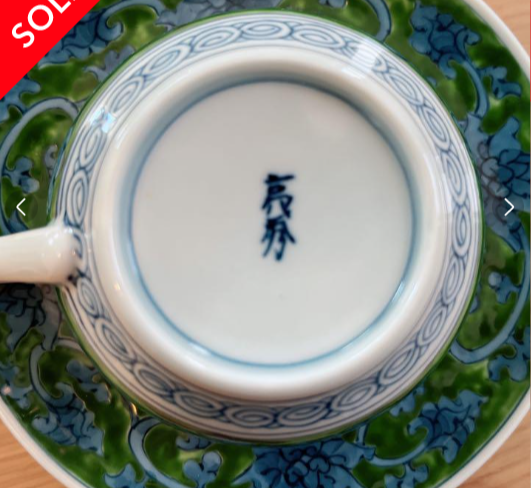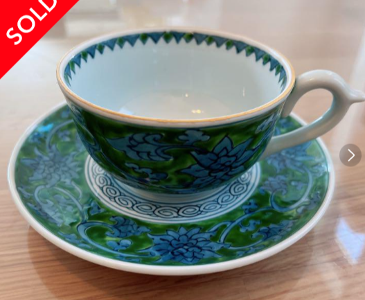 有田焼 古伊万里様式 染錦 色絵 草花文 緑彩唐花 亮秀窯 カップ&ソーサー 田代亮秀 碗皿 手描 盛上柚 釉彩